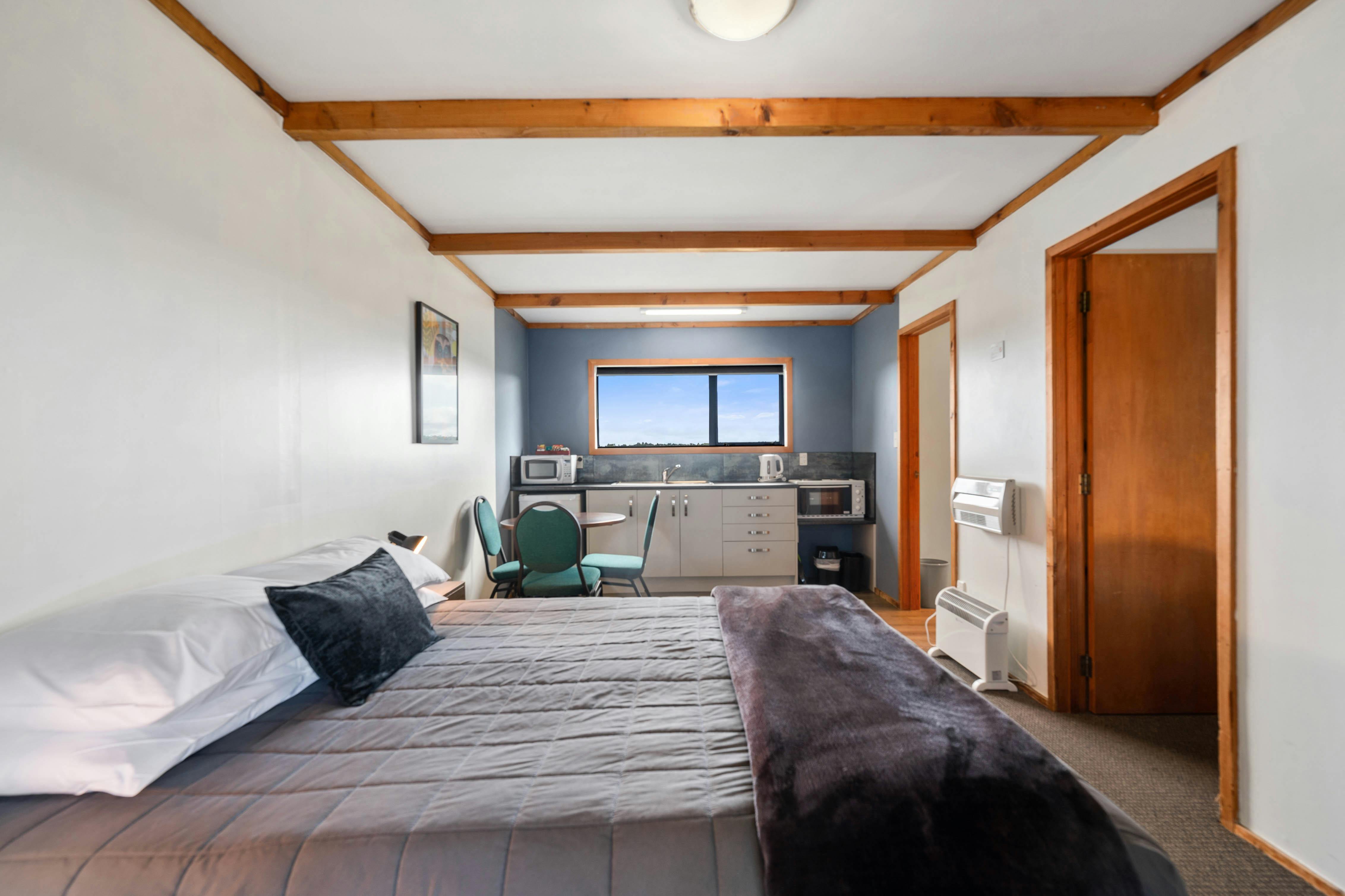 This unit has a Queen bed in the same room as the kitchenette & a separate room with a single & a bunk-bed.